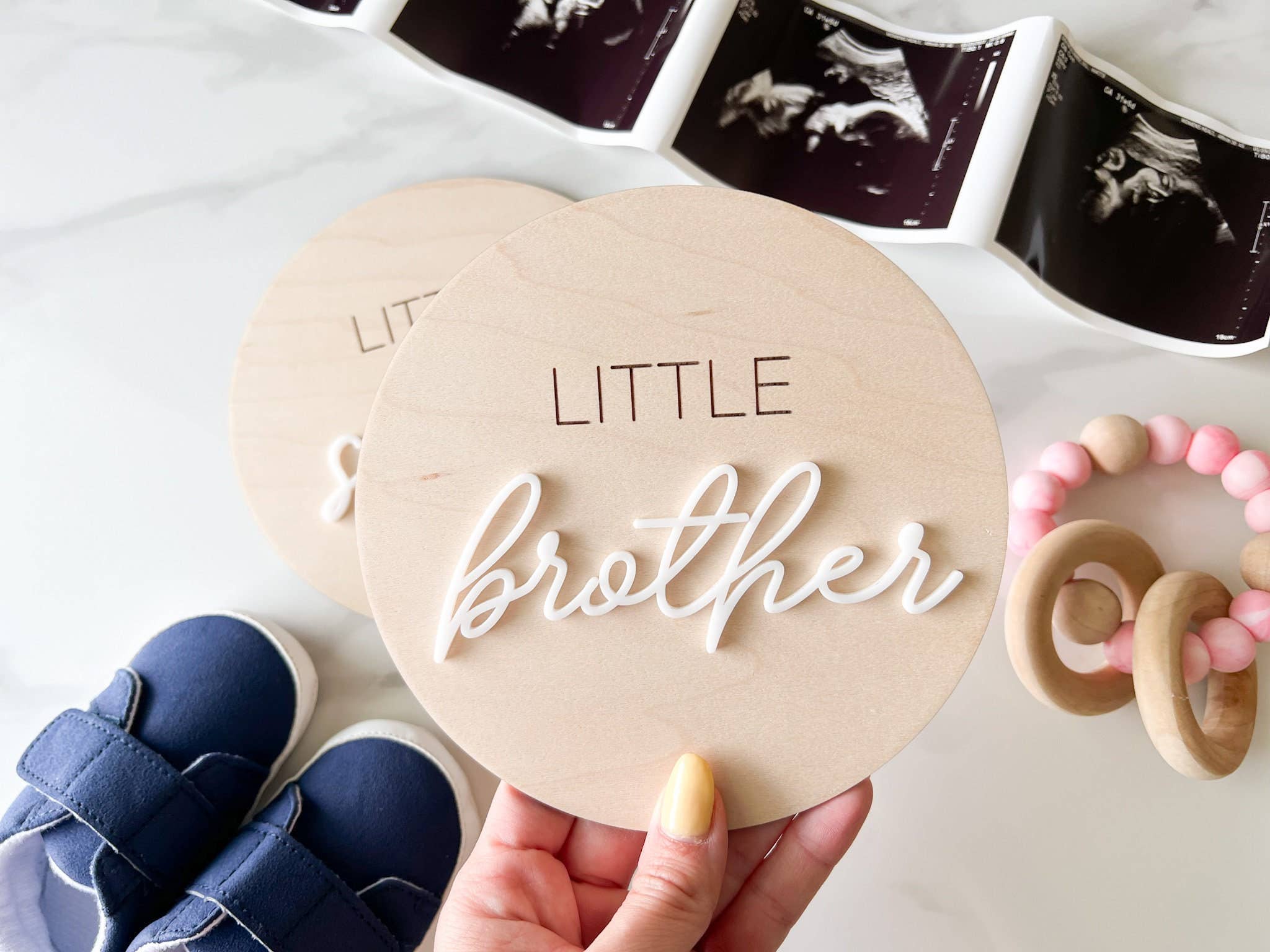 The Big Brother / Big Sister Announcement Sign is an excellent option for announcing new baby's gender. This sign features a "LITTLE sister" announcement and is perfect for use as a hospital photo prop or as a gender reveal.