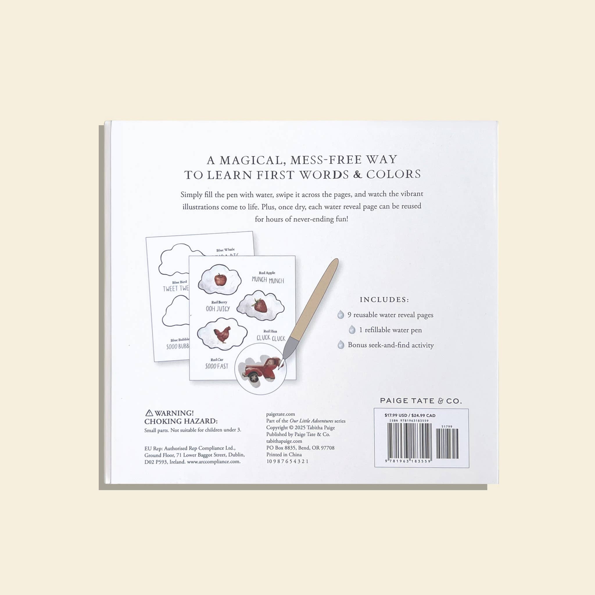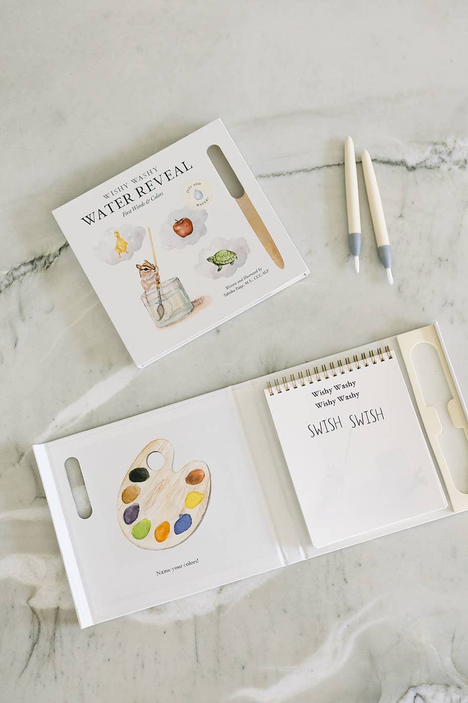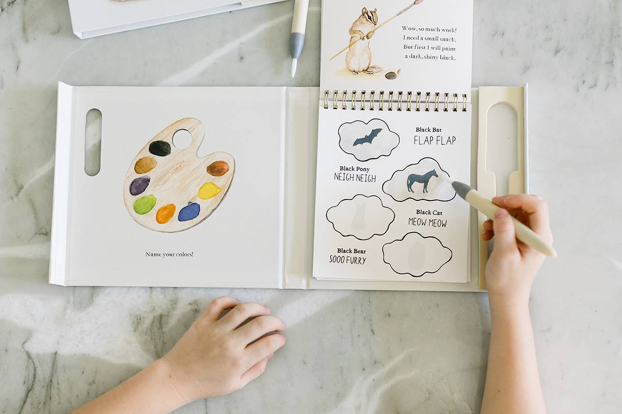 This interactive edition of Wishy Washy features 9 reusable water reveal pages—fun, mess-free play kids can enjoy again and again • Created by a licensed speech therapist and artist, blending beautiful art with developmental value • Includes a chunky, easy-grip water pen that stores neatly in the spiral-bound format—great for travel displays • Supports early language development, fine motor skills, and sensory exploration • A thoughtful, screen-free activity option for parents, caregivers, and gift-givers categories: activity book, toddler, first words, early learning, travel toy, water reveal, water wow, water wow books, activity books for kids, tabitha paige books, water reveal book, Christmas 2025, vintage, stocking stuffers, holiday kids