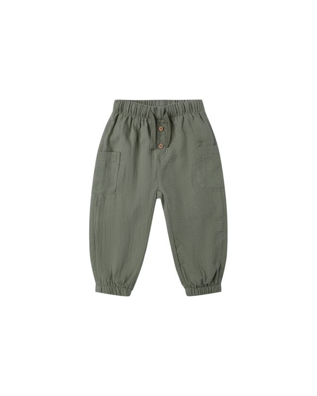 Comfortable corduroy pants with an elastic waistband and leg openings, adjustable drawstring, and side patch pockets.