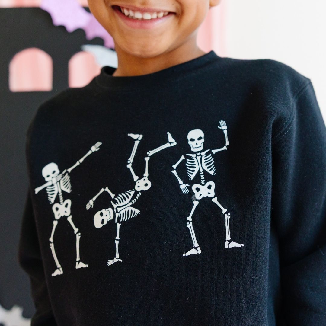 The Silly Skelly Glow In The Dark Halloween Sweatshirt is a fun and festive sweatshirt for celebrating Halloween!