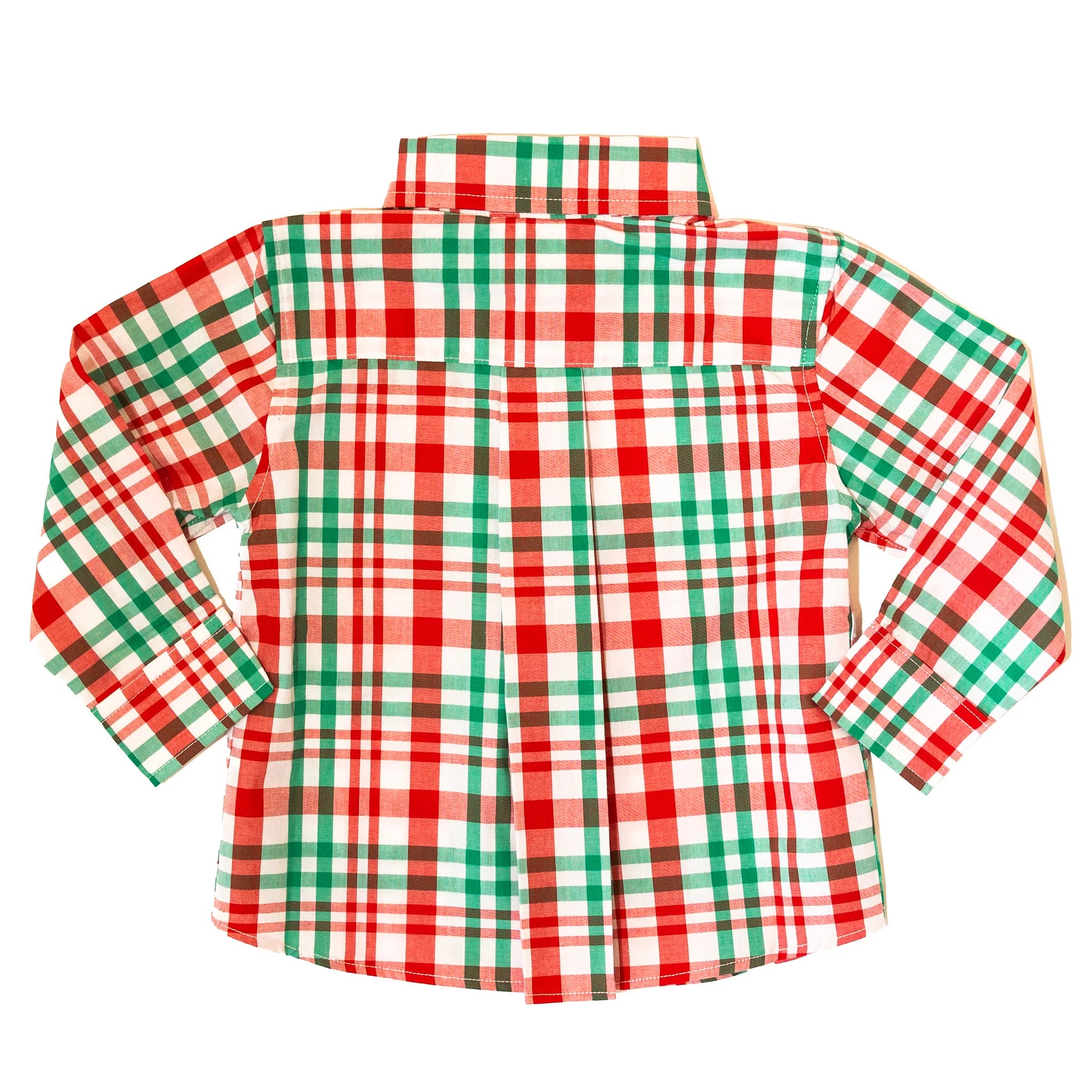 Have the whole family looking sharp for Christmas photos. This is a perfect shirt for those big boys who want to match their siblings! Made of light weight Christmas plaid fabric with an embroidered Christmas wreath, this button-up is an easy choice! Don't miss the sibling match outfits, perfect for all your holiday photos and occasions!