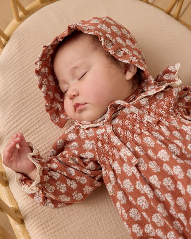 Organic cotton gauze baby bonnet with delicate ruffle trim, ties at the chin, and elastic at the back neck for a soft, secure fit.