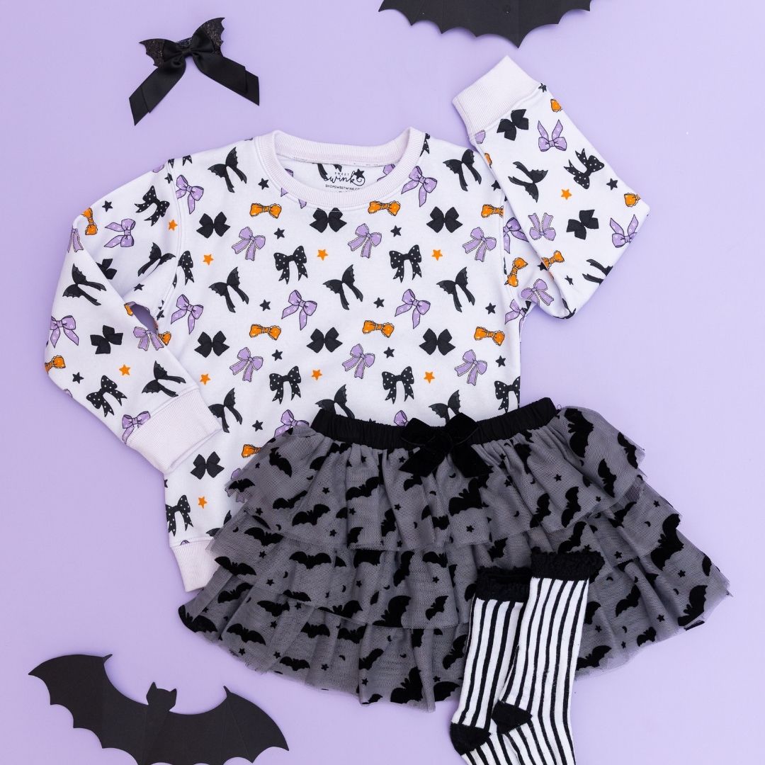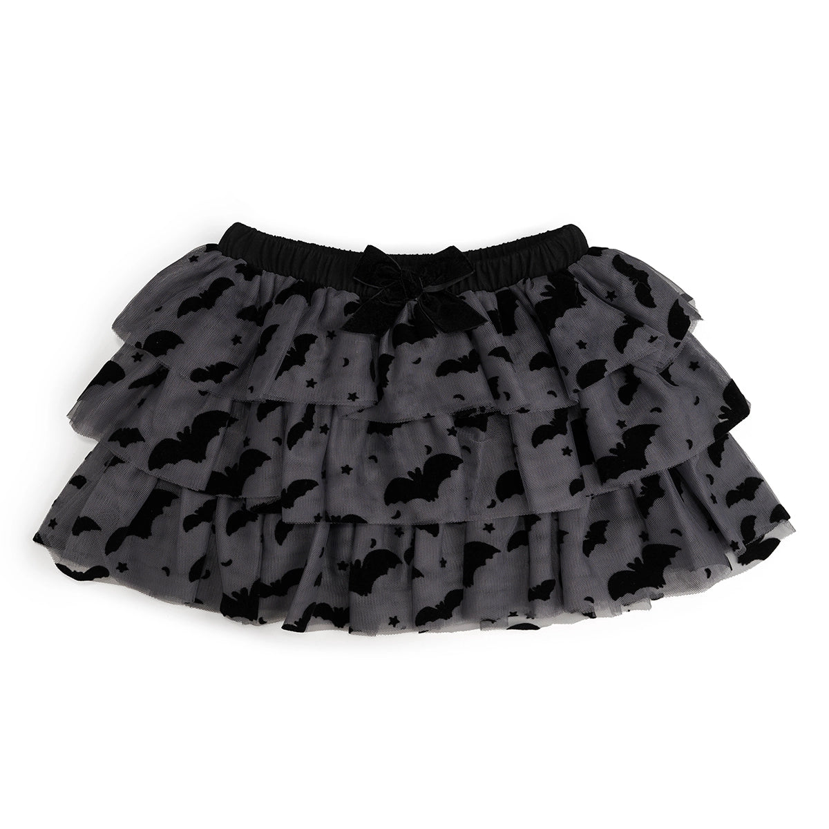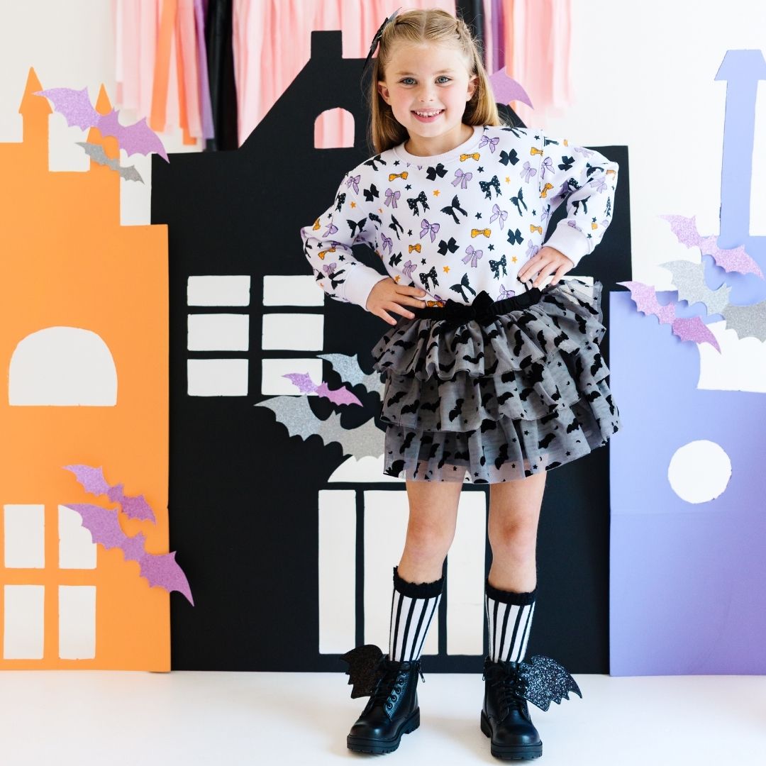 The Flocked Bats Halloween Bow Tiered Tutu is a fun skirt and dress up tutu for celebrating Halloween!