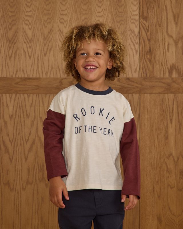 Our boxy-fit Camden Long Sleeve Tee is a seasonal staple, featuring contrast neck ribbing for a cool, classic look. Shoulder snaps included on sizes 0-3M - 18-24M for easy changes.