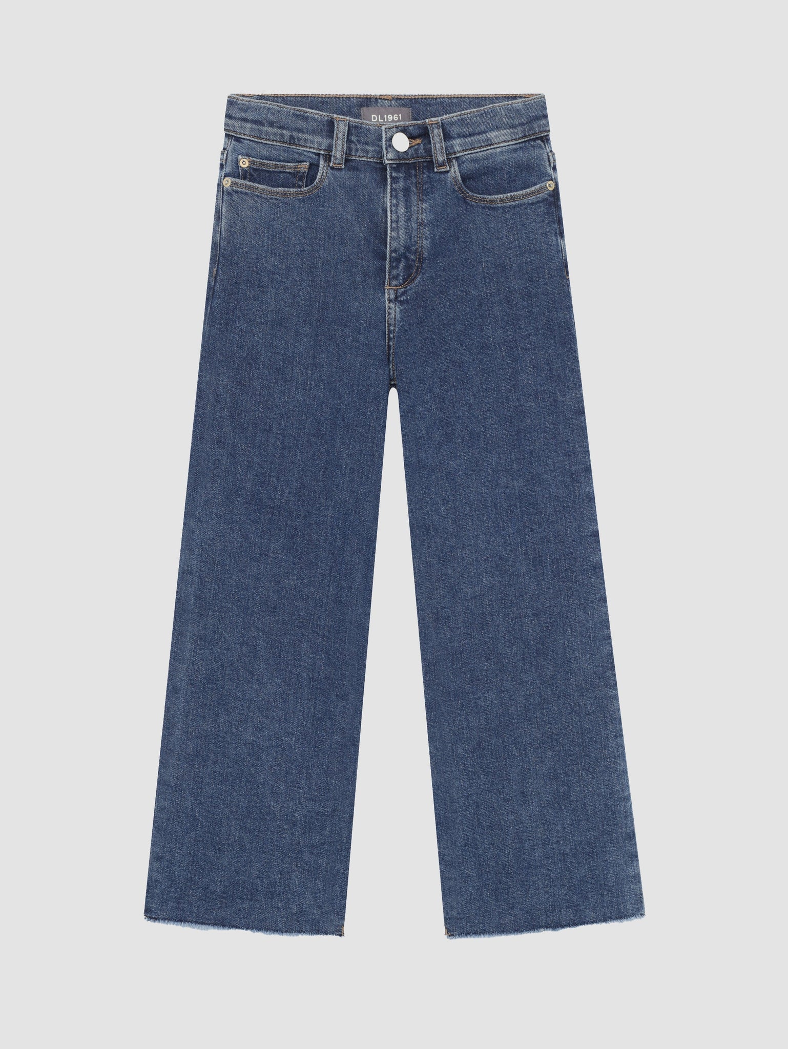 Adams is a vintage mid-indigo. It features brushed gold hardware, khaki stitching and a raw hem.