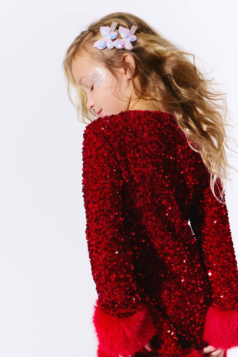 • Add sparkle to any holiday occasion with the Ruby Shimmer Dress, featuring all-over red sequins for a radiant look.