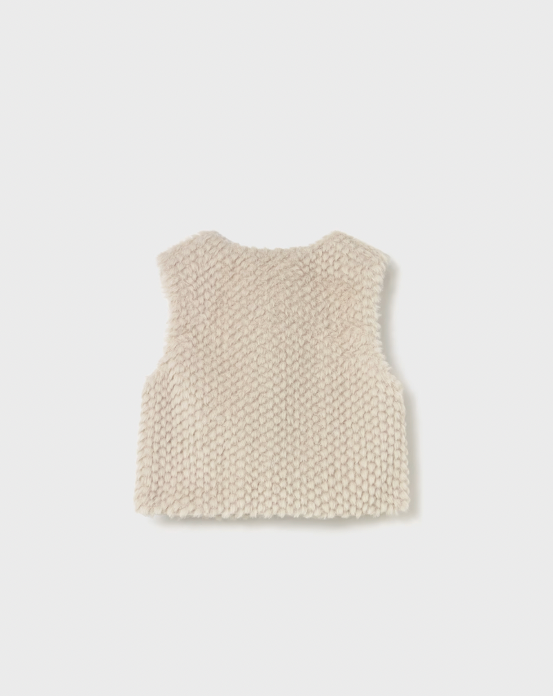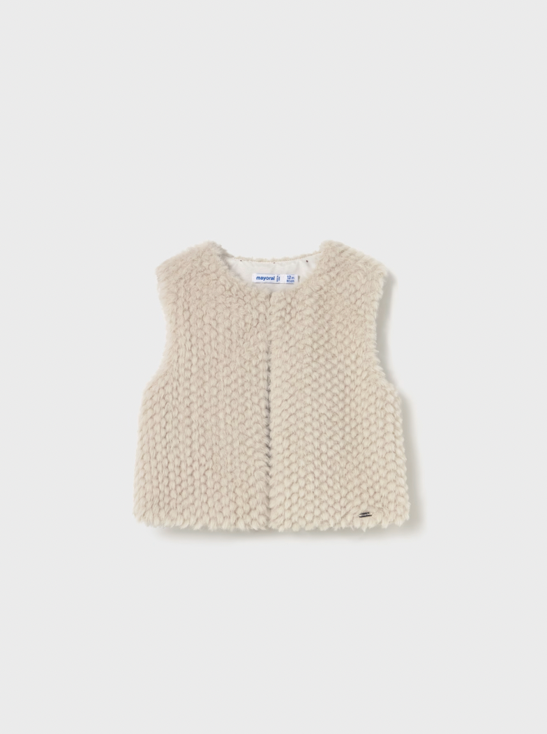 Vest for baby. Fastening with hidden clasps for a quick fit. Soft and smooth outer faux fur fabric. Soft polyester inner lining.