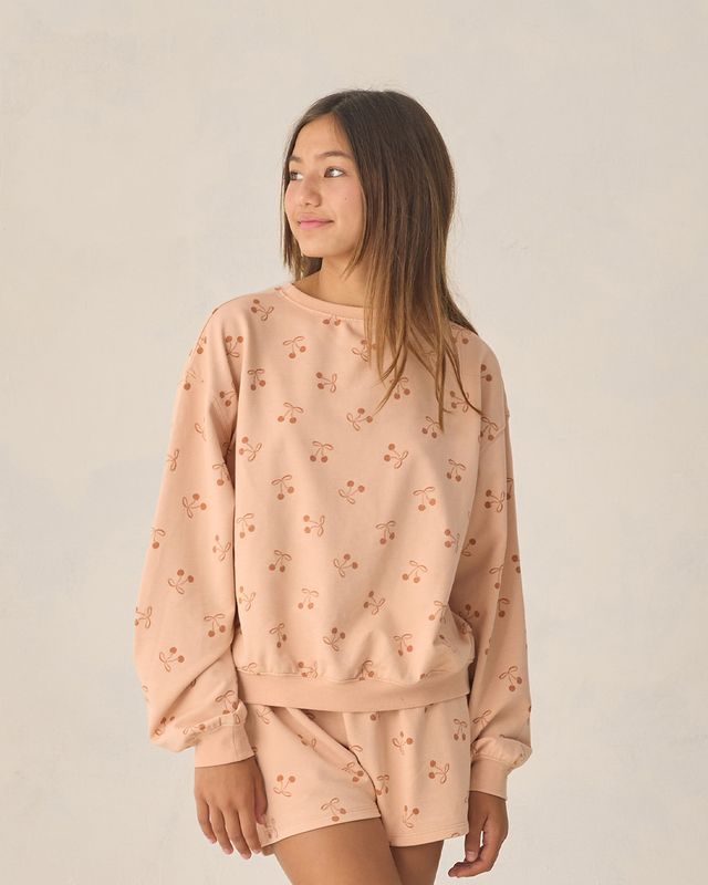 A relaxed sweatshirt and matching shorts with pockets and an elastic waistband come together in this cozy french terry summer set.