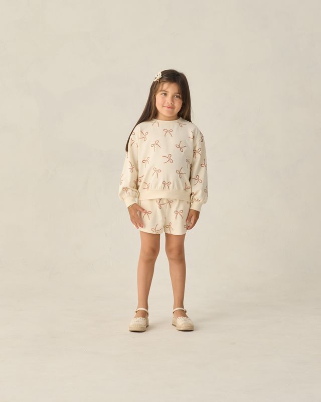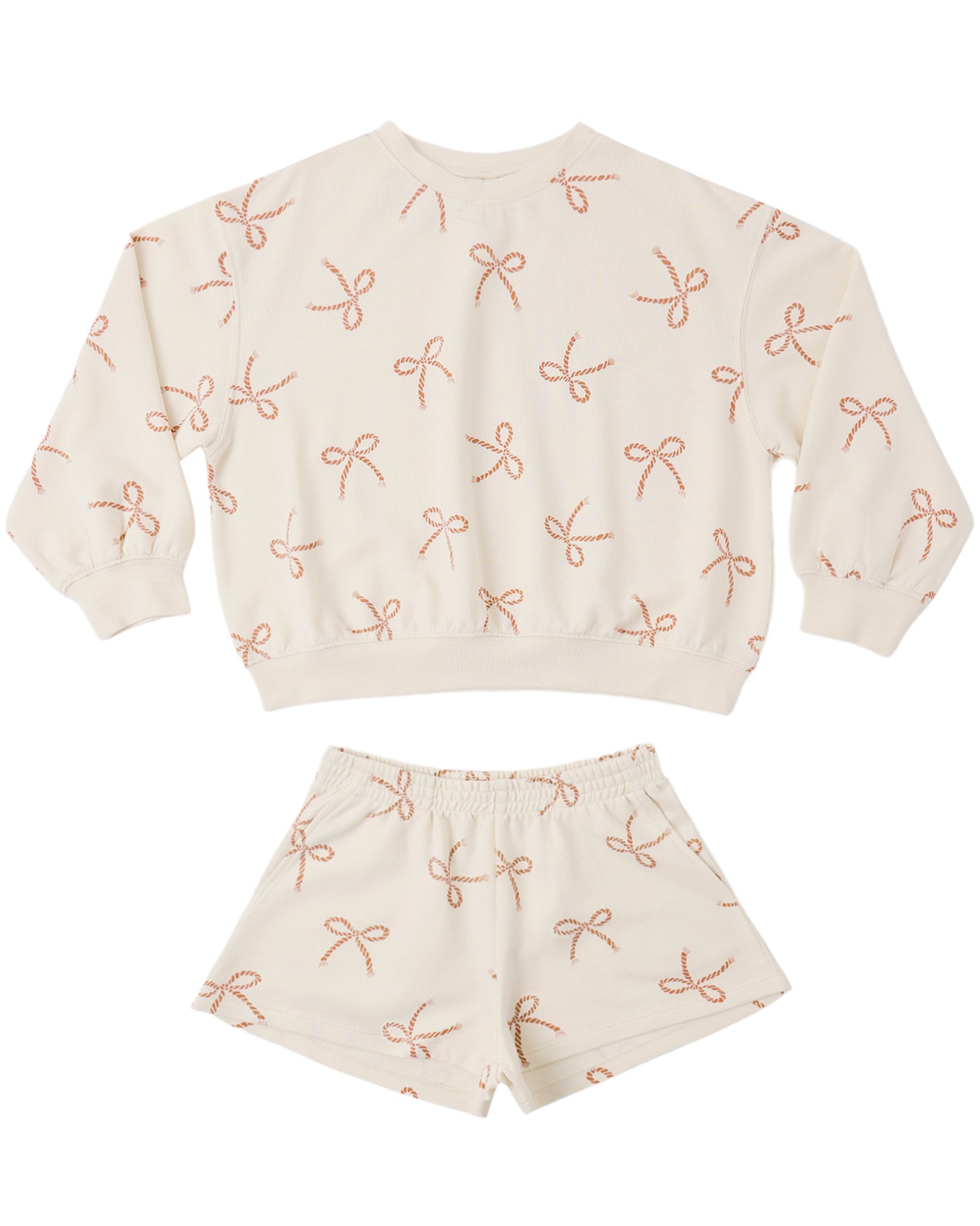 A relaxed sweatshirt and matching shorts with pockets and an elastic waistband come together in this cozy french terry summer set.