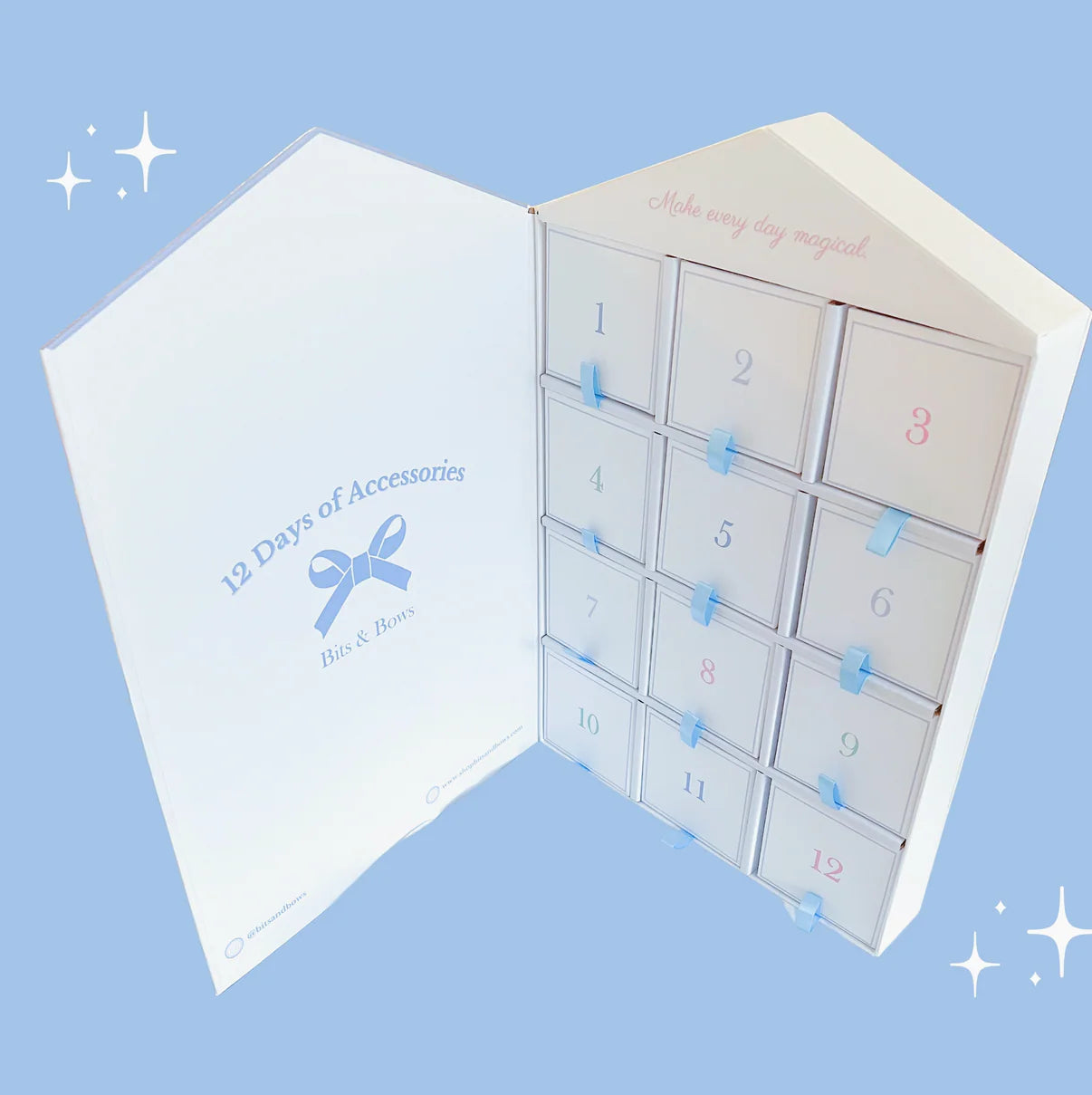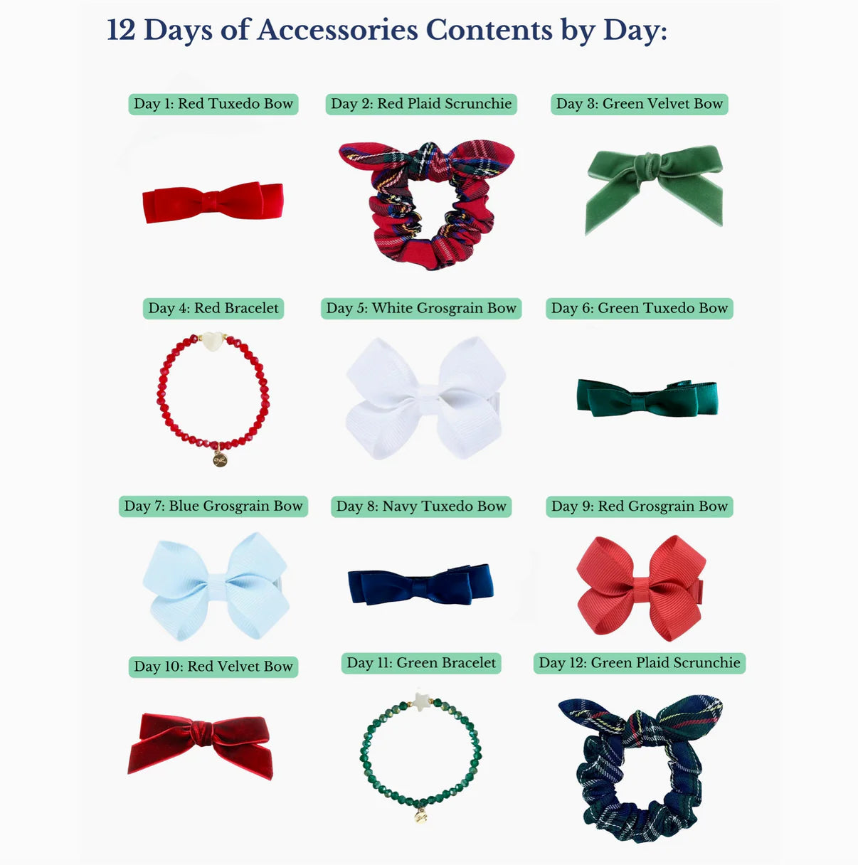 12 Days of the sweetest accessories are sure to bring her holiday cheer and outfit her in accessories she can wear all season long. Each day’s box drawer is filled with a hair bow, bracelet, or plaid bow scrunchie to make this gift giving season the most magical yet!
