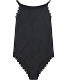 Black swimsuit for active children in recycled polyester with UV protection 50+. The swimsuit has a regular fit, soft wavy edges, is fully lined, and has a deep back with adjustable, thin straps that cross at the back. The product is CE-marked and tested according to standard EN-13758-1.